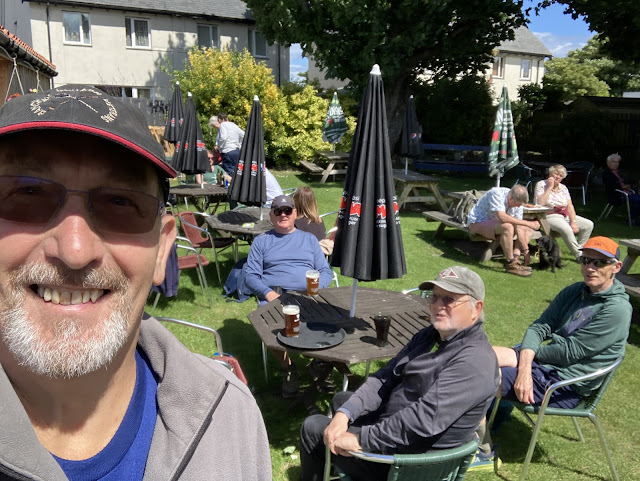 Sunday morning and Stewart had to leave us to head home and prepare for his big day representing AberNecessities ( www.abernecesseties.co.uk ) at Holyrood Palace. He subsequently sent us this photo from that day: Three options were available for the walk today. Rob was keen to drive down to Hadrian's Wall (about an hour away) but the rest of us didn't fancy spending two hours in the car, especially with the England - Slovakia match on TV at at 5 pm. Ken initially favoured a local hill walk but most of the rest of us preferred to take the relatively short drive to Craster for a coastal walk, so 6 of us headed east while Rob went south. Two cars - Dave and Gordon - parked just outside Craster where this sign showed some of the local attractions and walks: We started off walking away from the village - Ken had notions to see Howick Hall ( https://howickhallgardens.com/ ): Not a National Trust property and we knew dogs wouldn't be allowed in the house but we hoped to be able to...